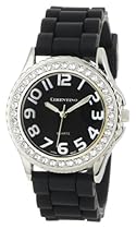 This is not your typical boyfriend watch. It's dazzling 39.7mm. round silver metal case is accentuated with 36pcs. clear rhinestones on bezel. Solid black dial with silver Arabic numbers 1-12 and 3 hands with logo. The 9-1/2" solid black silicone rubber strap has 8 holes and stainless steel buckle clasp closure which ideal for any wrist size. Great for everyday wear!